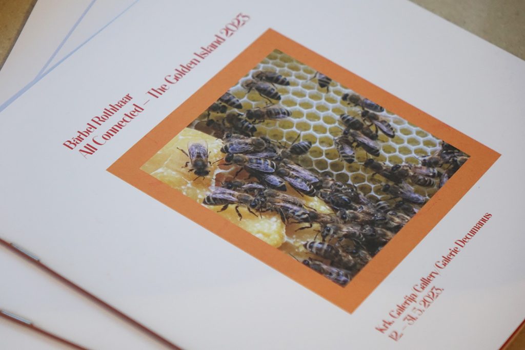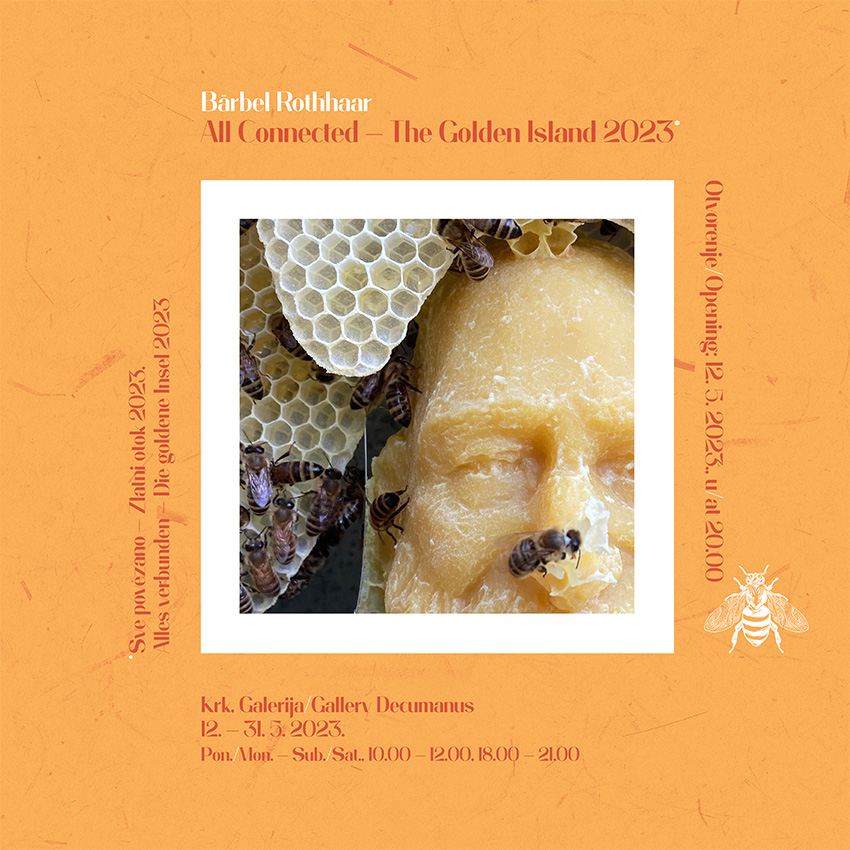 All Connected – The Golden Island 2023 (Sve povezano – Zlatni otok 2023.) inovativni je multimedijalni umjetnički projekt Bärbel Rothhaar koji je u jednom dijelu predstavio rezultat njezine ovogodišnje umjetničke rezidencije odrađene upravo na otoku Krku, i to u vremenu od 01. i 08. travnja. Bärbel Rothhaar već više od 20 godina radi s pčelama, istražujući, pritom, tradicije povezane s pčelarstvom, medarstvom i iskorištavanjem pčelinjeg voska. U sklopu ovog projekta, tijekom trajanja rezidencije, kreirala je nekolicinu novih djela koja nastavljaju koncepciju njezinih prethodnih radova. Koristeći najrazličitije umjetničke pristupe i zaista široki raspon medija, ti radovi istražuju povezanost čovjeka i prirode, posebice čovjeka i pčele. Jer u ovo, ekološki gledano, posebno osjetljivo vrijeme, pčele nisu samo pokazatelji stanja u okolišu, već i svojevrsni simbol nade i mogućih pozitivnih promjena, s time da u ovome kontekstu košnice postaju dijelom umjetničkog procesa. Ovom izložbom, koja je već prethodno gostovala u gradu Rockenhausenu (u tamošnjem Muzeju za umjetnost/Museum für Kunst), obuhvaćeni su sljedeći segmenti: minijaturni, gipsani portreti pčelara, zatim voštani odljevi istih lica prekriveni saćem, peludna karta otoka Krka, pčelinji foto-studijo pomoću kojeg posjetitelji galerije mogu doživjeti efekt pčelinjeg oka te slike većih formata čije pikselizirane površine podsjećaju na perspektive fasetiranih očiju pčela.