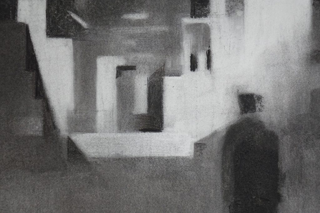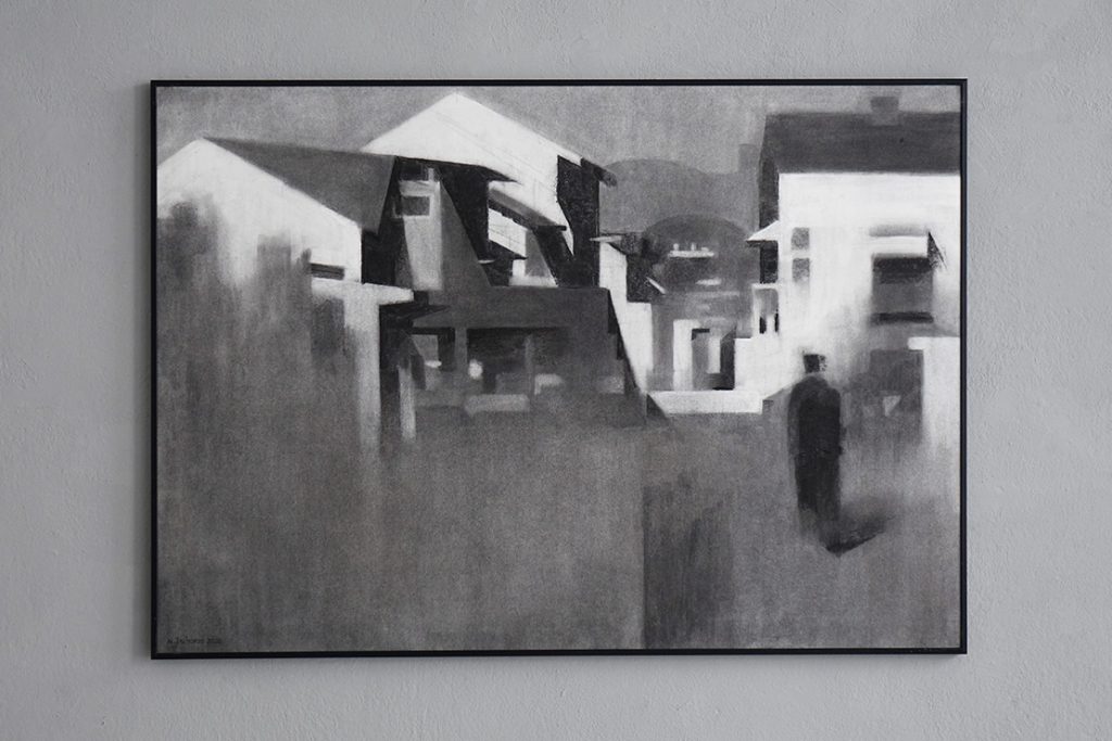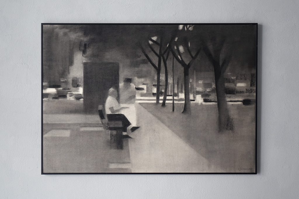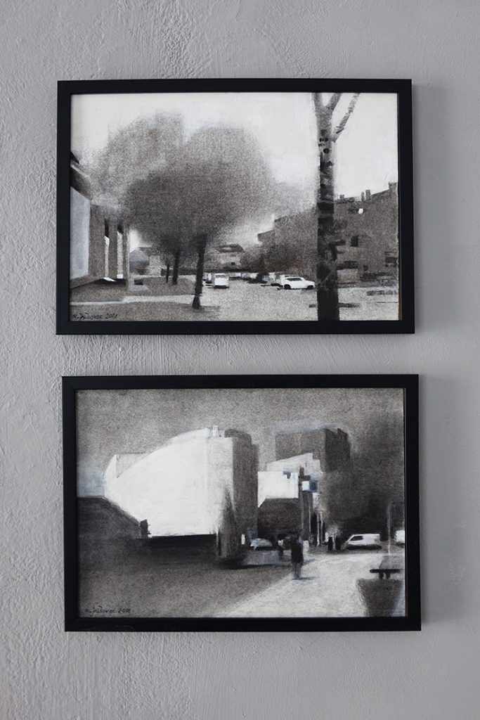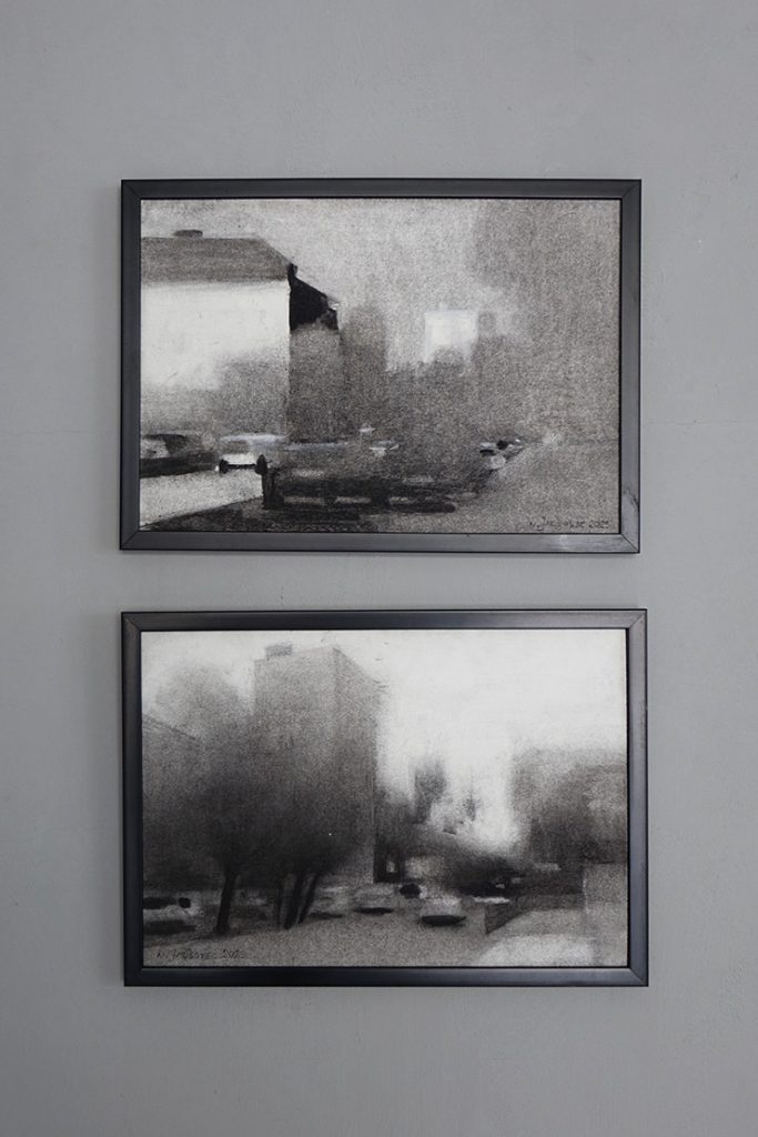 – Na desetogodišnjicu izložbenog projekta U kontrapunktu, imamo prilike susresti se s izvrsnim likovnim stvarateljima, navodi Ritoša, a ovogodišnjim izložbenim diptihom U okviru fokusiramo se na crno-bijelu tehniku, kod Nenada Jalšovca u ugljenu, a Fanite Barčot-Nikolac u fotografiji. Monokromatski izražaj izaziva posebnu atmosferu nostalgije, ali i prezentira potrebu za jasnijim sagledavanjem stvari. Raščišćavaju se prikazani objekti i svode na osnovno, naglašava se kontrast, tekstura, kompozicija. Oboje su okrenuti unutrašnjim stanjima i potrebom da iskomuniciraju proces kroz koji prolaze i intenzivne emocije koje ih zaokupljaju. Oboje rade promišljenim i postepenim tempom, snažno pokrenuti fenomenom svijetla i sjene. Spajaju ih i teme koje uključuju pitanja otuđenosti, izolacije, pokušaje komunikacije i osjećaj neshvaćenosti. Spaja ih, također, izraziti individualizam. Njihova djela prožima filozofija egzistencijalizma, pri čemu se naglašava sloboda, odgovornost i jedinstvenost pojedinca u suočavanju s vlastitim postojanjem. Ljudi su bačeni u svijet bez unaprijed određene svrhe te su odgovorni za svoje postupke i identitet, i pronalazak smisla u kaosu inherentnog besmisla. Potpuno svjesni ove istine oni na poetične načine istražuju perspektive interne stvarnosti u kontrastu s vanjskom; kod Jalšovca vanjski prostori postaju tema koja se obrađuje na intimistički način, a Barčot-Nikolac unutrašnje prostore teatralizira na van. Izložbom Crteži, tumači nadalje Ritoša, predstavlja nam se vrhunski majstor svjetla i sjene Nenad Jalšovec koji tehnikom ugljena oblikuje pomno odabrane kadrove najčešće gradskih, često zagrebačkih vizura. Scene koje rijetko susrećemo u svijetu likovnosti interesni su fokus autora: automobili, parkirališta, prometne ulice, stambene zgrade. Uz njih se javljaju stabla, parkovi, rjeđe ljudi. Ovaj neobični odabir motiva izaziva začuđujući efekt u spoju s manirom izvedbe. Meki, sanjivi, pastozni pokreti ugljenom oblikuju pjesničku impresiju i sudaraju se s banalnim prizorima parkirališta. Svaki crtež poziva promatrača da promišlja o značenju ovih svakodnevnih scena. Autorov izraz odiše snažnom unutarnjom harmonijom, osjećajem mira i kontemplacije. Oduševljava njegova sposobnost da u chiaroscuro tehnici, bez pretjeranih detalja, stvori vrlo jasne oznake predmeta. Zgrade, ulice i stabala modelira virtuoznim suptilnim naznakama linije i plohe. Svodeći objekte na najbitnije, a pri tom zadržavajući njihova glavna obilježja, prenosi dojam zamagljene fotografije. Njegov proces rada obuhvaća primarno rad na otvorenom, u skladu s plain air metodologijom, no naknadno provodi elaboraciju u domaćem okruženju. Tijekom ovog procesa, pažljivo izdvaja ključne scene i reducira elemente, što rezultira izuzetno čistim i fokusiranim kompozicijama. Ovaj minimalizam pojačava poetski aspekt njegovih radova, što ih čini usporedivim s metafizičkim urbanim pejzažima Giorgia de Chirica. Automobili koji stoje ili se kreću u vatastoj mekoći izazivaju čuđenje i nejasnost, inače simboli brzine, buke i kronične vreve gradskog života ovdje su zarobljeni u tišini te gube svoj uobičajeni smisao i postaju tajanstveni. U svijetu mekoće i zagušenog zvuka nalazimo potpunu autonomiju autora koji nas vodi u oblast gdje se slikarski intimizam stapa s vanjskim prostorom, zaključuje Ritoša.