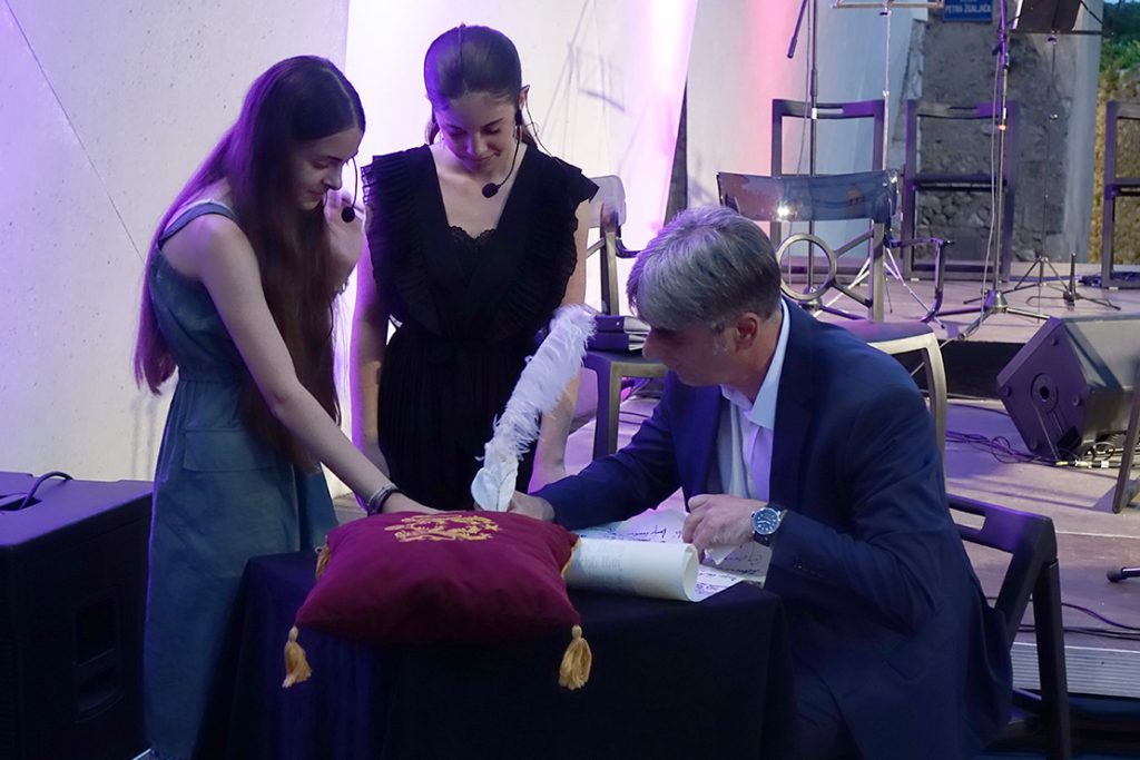 No, u vrhunska događanja obje festivalske priče, svojom su scenskim nastupom uvele krčke školarke Pia i Mare, podijelivši s publikom zanimljive činjenice ne samo o Trgu krčkih glagoljaša kao sjecištu dviju rimskih ulica – carda i galije, već i činjenice o poznatom američkom skladatelju Georgeu Gershwinu kojim je započeo koncertni program (Summer time, My man’s gone now…), da bi ceremoniju otvorenja, naposljetku, zaključio gradonačelnik Darijo Vasilić, pozdravivši okupljene ljubitelje klasične glazbe i, kao što nalaže tradicija, potpisavši festivalsku povelju.